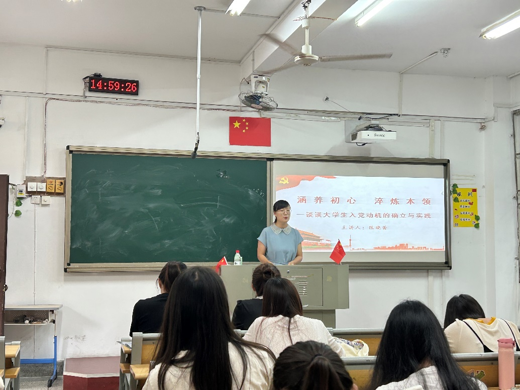 第二十二期入党积极分子党校培训第四讲于综南201举行。本次培训以“涵养初心,淬炼本领——谈谈大学生入党动机的确立与实践”为主题,由陈晓蕾老师主讲,全体入党积极分子参加。