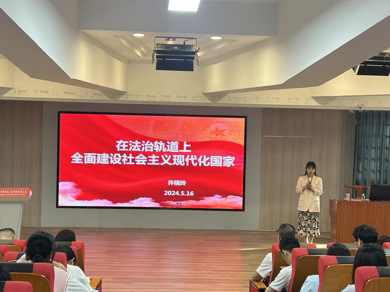 课上,许晓玲老师围绕“党的二十大报告中关于‘法治’的论述”“二十大专章进行‘法治’的部署”“‘法治轨道’上的我们”等三个部分展开详实的讲解。她还结合生活中的真实司法案例深入浅出地讲述了法律对我们的重要性,它与每个人的生活息息相关,并进一步强调在“法治轨道”上的我们要自觉弘扬社会主义法治精神,传承中华优秀传统法律文化,做社会主义法治的忠实践行者。