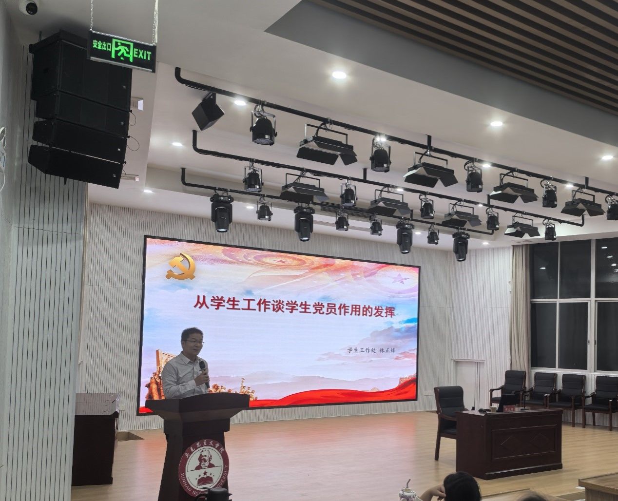 课上,林正锋老师围绕全国高校思想政治工作会议精神,以高校学生党建工作为主线展开阐述。他首先介绍了改革开放以来我国高校学生党建工作的历史进程,指出从“恢复发展”到“新时代新发展”的跨越体现了国家对学生党建工作的重视;紧接着,他引导学员们了解学生党建在学生工作中的重要性,并讲述我校党建与思政工作品牌体系,以我校为例深入而细致地分析了当前学生工作中面临的诸多难点和问题,提出了一系列改进建议;最后,他深入剖析并阐述了学生党员如何在实践中有效助力学生工作。他强调,学生党员作为青年学生中的佼佼者,应当充分发挥先锋模范作用,为学生工作的顺利开展贡献力量。