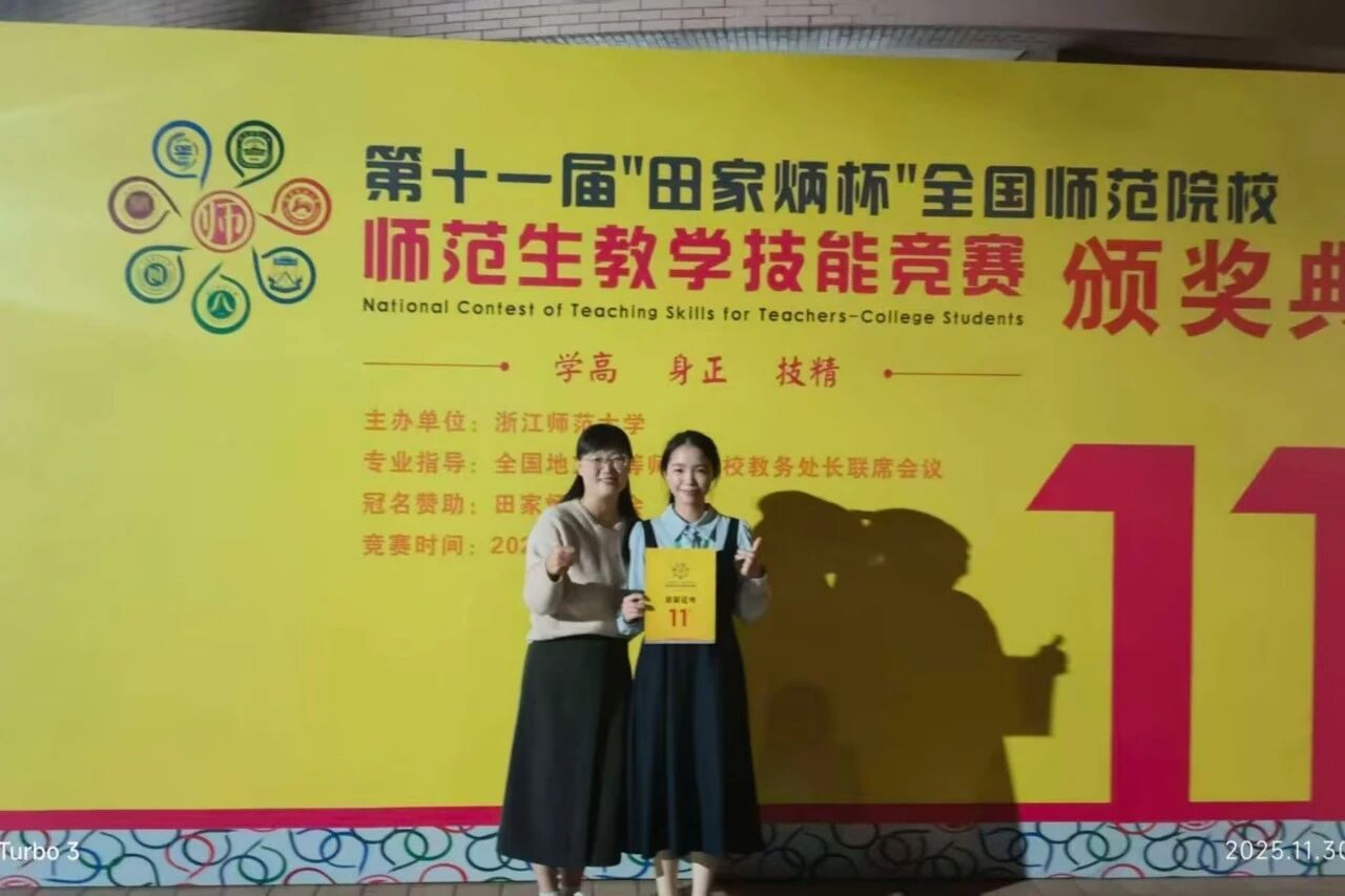 近日,第十一届“田家炳杯”全国师范院校师范生教学技能竞赛在浙江师范大学举行。在思想政治教育组比赛中,由动漫屋 “三人行”师生成长工作室教师团队共同指导的2023级思政一班学生白欣琳,凭借扎实的教学功底与出色的现场表现,荣获全国二等奖。