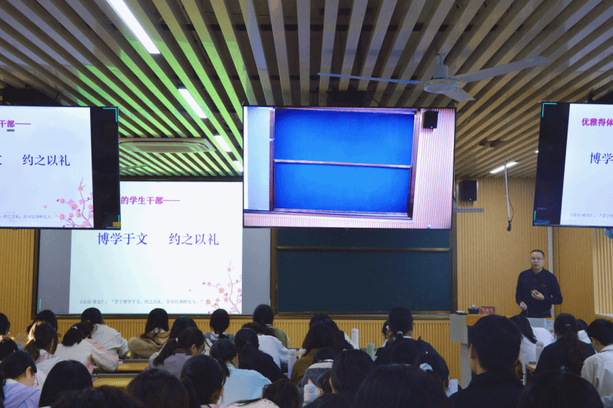党委副书记邓战军老师聚焦“学生干部礼仪素养”主题,开篇明义地鼓励学员们勇于沟通,不断提升人际沟通能力;通过启发式引导,锤炼学员思辨能力;同时提醒大家“博学于文”,在工作与生活中“约之以礼”,律己敬人。以“对人敬一点、仪容净一点、穿干练一点、语言甜一点、微笑多一点、眼神正一点、仪态雅一点”的总结,勉励全体学员做优雅得体的闽师学子。