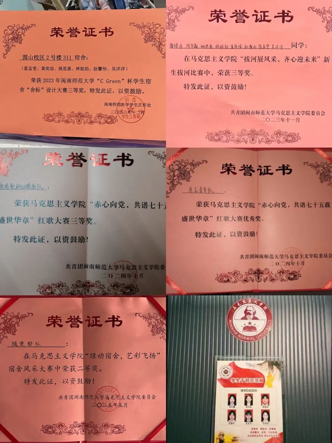 无论是学院迎新的忙碌现场、校运会的志愿服务岗,还是宿舍风采大赛的闪耀舞台,她们始终以 “宿舍” 为单位集体报名,将六个人的力量拧成一股绳。舍标设计大赛时,宿舍的书桌被画纸与彩笔铺满,六人围坐一圈头脑风暴,从线条的勾勒到色彩的填充,每一笔都藏着共同的巧思,每一个图案都凝聚着对宿舍的热爱;宿舍风采大赛的舞台上,她们对着镜子反复排练到深夜,一个眼神、一个动作都默契十足,最终凭借亮眼的表现一举拿下二等奖;红歌大赛的赛场中,她们身着统一服装,以铿锵有力的旋律致敬信仰,不仅捧回了三等奖,还收获了优秀奖的双份荣誉。一张张奖状渐渐贴满了宿舍的墙面,也见证着六个女孩从青涩到成熟的蜕变。这份亮眼的集体成绩单,让她们成功斩获 “学生干部示范岗宿舍” 的称号,成为学院里人人称赞的榜样集体。在各类集体活动中,她们总能分工明确、配合默契,成为老师信赖、同学认可的 “活力六人组”。她们的身影穿梭在校园的各个角落,用一次次并肩前行的经历,生动诠释着 “小宿舍” 融入 “大集体” 的温暖担当。