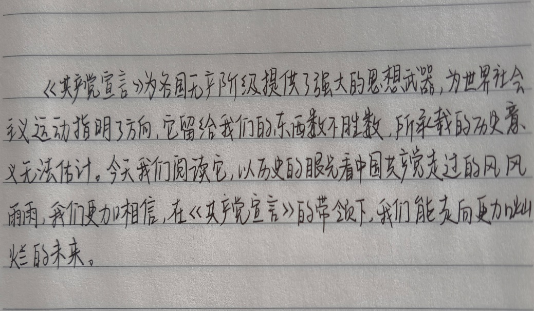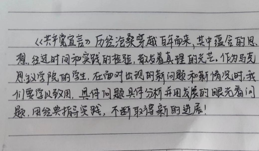 通过此次关于《共产党宣言》的读书会,帮助同学们更好地理解马克思主义的丰富内涵和精髓要义。同时也激励了大家进一步掌握和运用马克思主义的立场观点方法,不断从中汲取智慧和力量。用理想之光照亮奋斗之路,用实践伟力开创美好明天!