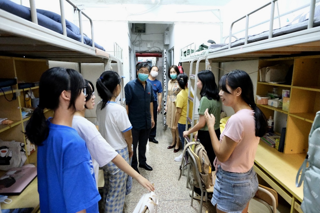 在本科生迎新点,李定庆书记检查了迎新工作情况并嘱咐本科生宿舍条件有限,希望各学生组织、下班党员、班主任助理、学长学姐们共同做好服务保障工作,帮助新生尽快适应宿舍生活。随后,院领导对本科生宿舍进行走访,详细询问新生入住情况及到校感受,当了解到一名新生由于床位原因,独自与高年级同住,且因舍友厦门返漳,仍在宿舍隔离,无法参加新生活动时,院领导坚持与该生进行线上“走访”。李定庆书记和陈佳薇副书记与李同学在宿舍外一门之隔进行视频通话,关心该同学的生活适应情况,并介绍了该宿舍其他优秀学姐的情况,叮嘱她借此机会多向学姐们学习,请教。