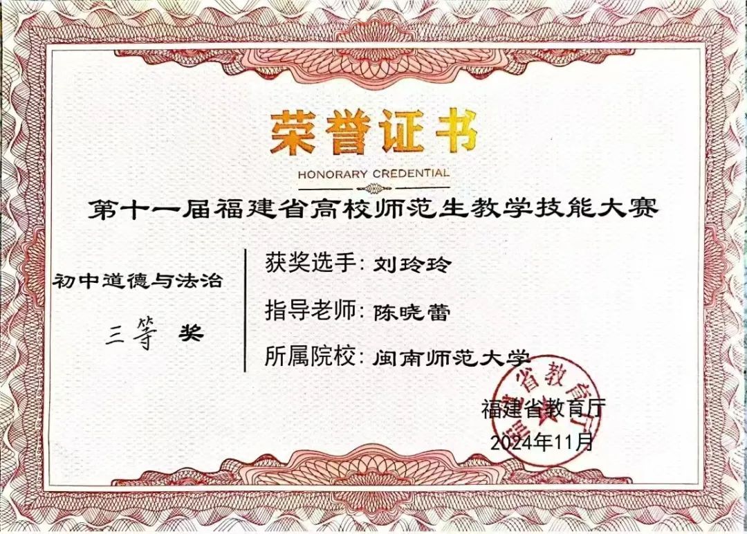 11月16日,由福建省教育厅主办的第十一届福建省高校师范生教学技能大赛在泉州师范学院举行。在动漫屋 刘玲元、郑育琛、陈晓蕾3位老师的指导带领下,动漫屋 21思政1班胡紫嫣、21思政2班谢辛雨荣获二等奖,21思政1班刘玲玲荣获三等奖。本次比赛充分展现了动漫屋 学子良好的职业素养和专业水平。未来动漫屋 将进一步加大对教师队伍的培养力度,推进教师专业化建设,为教育事业蓬勃发展贡献力量。