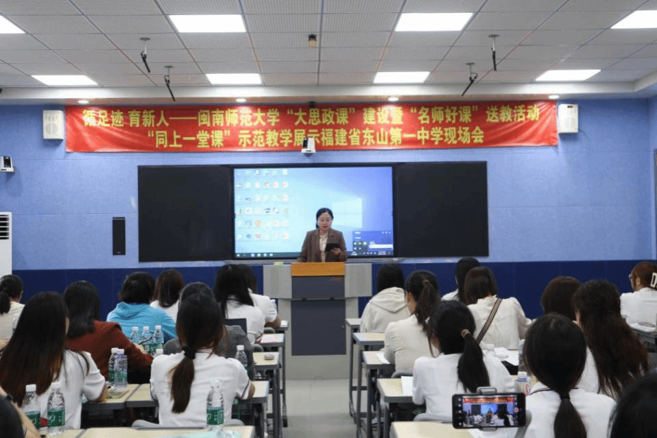 师生齐聚福建省东山第一中学弘毅楼四楼播放室,参加“同上一堂课”示范教学展示活动。本次示范课程由漳州市各中小学优秀思政课教师担纲授课,展示了不同学段的思政课堂风采,为实践团成员带来了深刻的思政教育体验和宝贵的教学启示。