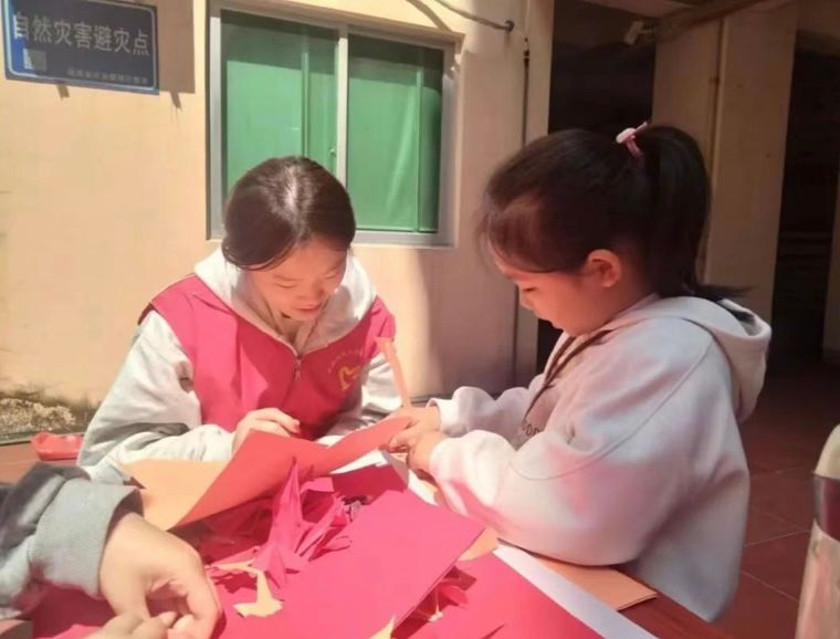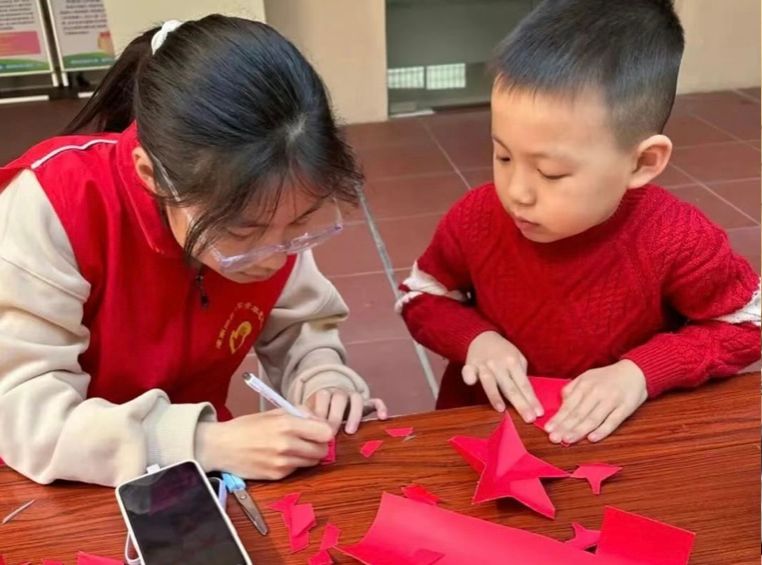 活动尾声,志愿者们组织孩子们共同制作红星与和平鸽,在志愿者的耐心指导下,孩子们手持彩纸、剪刀等工具,用稚嫩的双手裁剪心中的美好愿景,一颗颗红星在指尖绽放光芒,一只只和平鸽展翅欲飞,将整个活动推向了高潮。
