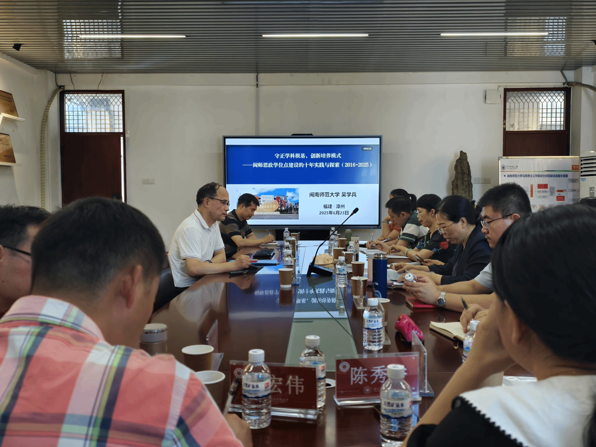 会上,陈再生院长和吴学兵教授分别做了“凝心聚力推动研究生教育高质量发展”和“守正学科根基,创新培养模式——闽师思政学位点建设的十年实践与探索”的主题分享,并重点介绍了学院在研究生培养模式构建、课程体系优化及实践机制创新等方面的经验做法。龙岩学院方面介绍了学院办学和硕士点建设的相关情况,并希望在研究生培养方案制定等方面得到指导和帮助。最后,双方围绕研究生培养模式、课程体系、实践机制等核心议题展开深入研讨。