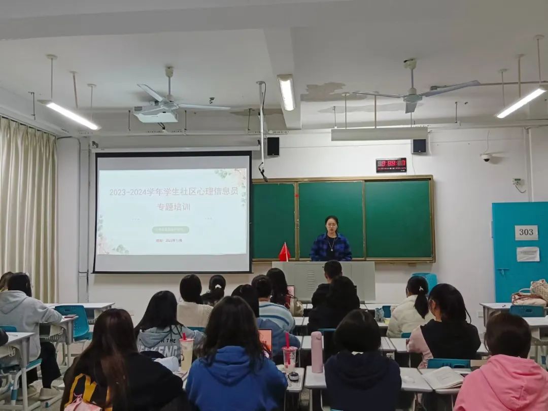在圆山新教学楼303开展2023-2024学年新生社区心理信息员专题培训。培训由心理助管郑长英主持,心理辅导站站长沈书伊老师主讲。(通讯员 郑长英)