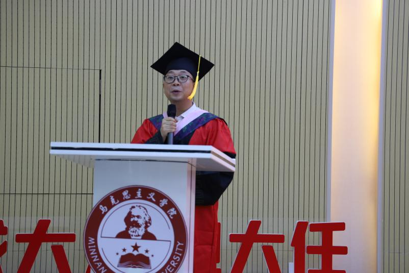随后,陈再生院长致辞。他指出,这几年正是学院大发展、大提高的时期。在马院师生的共同努力下,学院取得了一系列成绩,驶入了发展的快车道,见证了学院成立十周年,学院并以此为起点接续奋斗。全体马院人爱岗敬业、奋发有为,战斗在教书育人的一线,承担着科学研究、社会服务的重任,为福建省重点建设高校、福建省“双一流”建设高校及和谐校园做出了应有贡献。在今年毕业的同学中,有5名研究生成功考博,28名本科生成功考取硕士研究生。这不仅是属于马院的荣誉,更是大家拼搏进取的印记。临别之际,他对同学们提出几点嘱托:一是希望大家目有山川,做一个成长路上志存高远的人;二是希望大家心有明灯,做一个拼搏路上善良温暖的人;三是希望大家胸有丘壑,做一个圆梦路上懂得坚持的人。