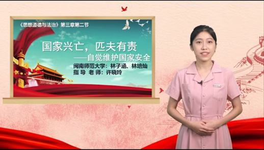 选送的由许晓玲教授指导、19级思政本科班林子涵和林培灿共同完成的作品《国家兴亡,匹夫有责——自觉维护国家安全》荣获全国本科组优秀奖。