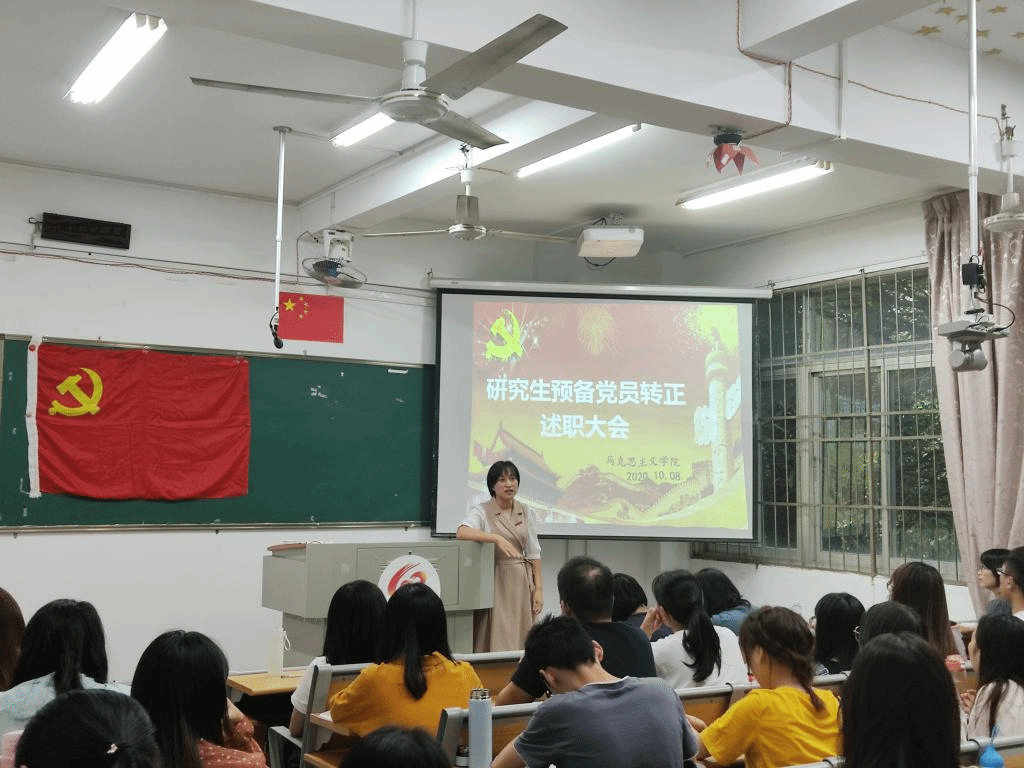 在综南201召开研究生预备党员的转正述职大会,党委副书记陈佳薇老师、党委组织员黄艳红老师、研究生第一党支部书记张妍老师、全体研究生党员、发展对象、入党积极分子参加了此次会议。