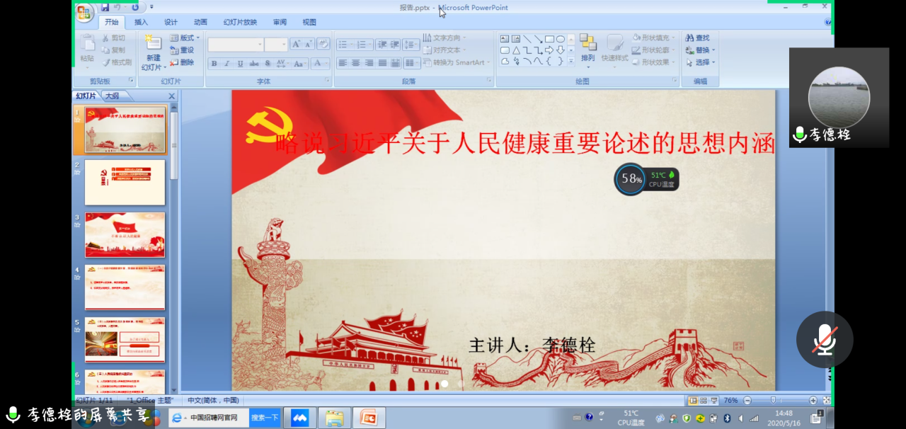 于腾讯会议开展分党校第十六期入党积极分子第六讲培训,本讲培训以“习近平关于人民健康的重要论述”为主题,由李德栓教授主讲,全体入党积极分子积极参与。