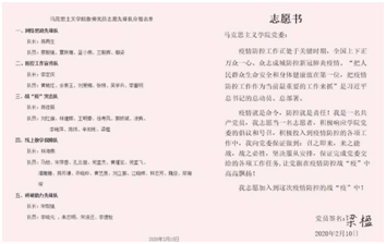 的党员同志们积极响应学院党委的倡议和号召,学院党员教师成立了以五位领导班子成员为组长的“五个一”党员志愿先锋队,充分发挥党支部的战斗堡垒作用和共产党员先锋模范作用,踊跃投入到疫情防控的各项工作中,把防控工作抓实抓细抓落地,坚决打好防控疫情的阻击战。