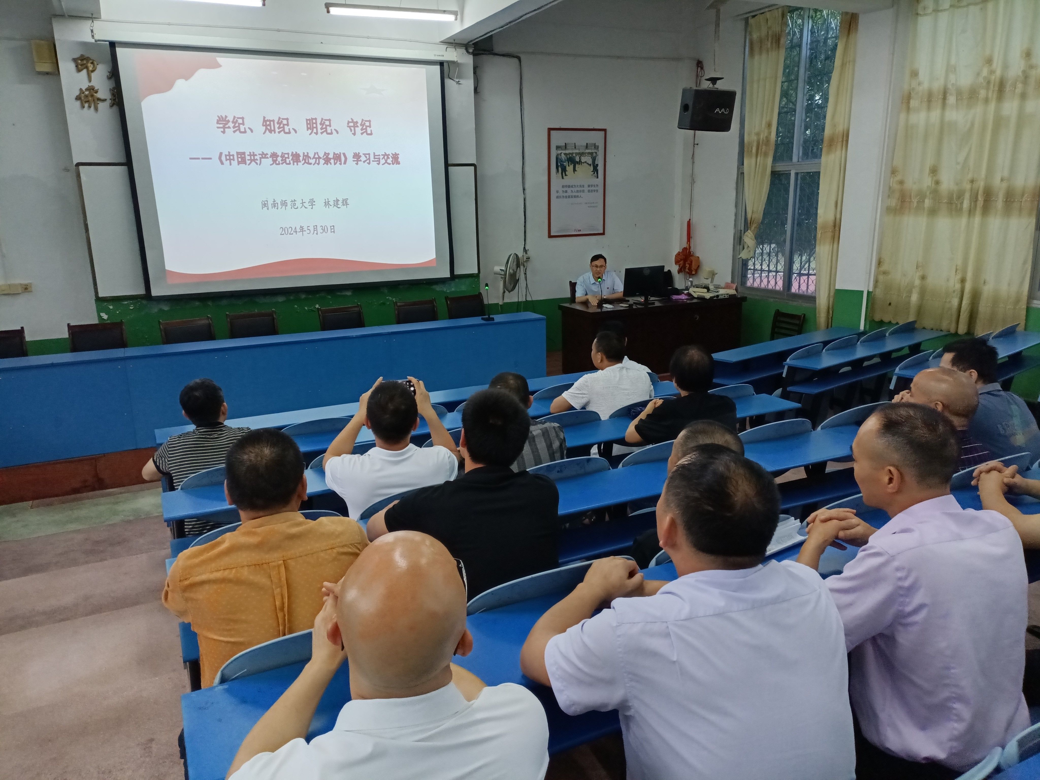 林建辉教授为南海中学的党员教师作题为“《中国共产党纪律处分条例》解读”的主题党课。林建辉教授从新民主主义革命、社会主义革命和建设、改革开放以及新时代四个阶段,深入剖析了党纪学习教育的历史传统和时代价值,详细解读了新修订的《中国共产党纪律处分条例》需要把握的四个问题、“六大纪律”修订的主要内容。