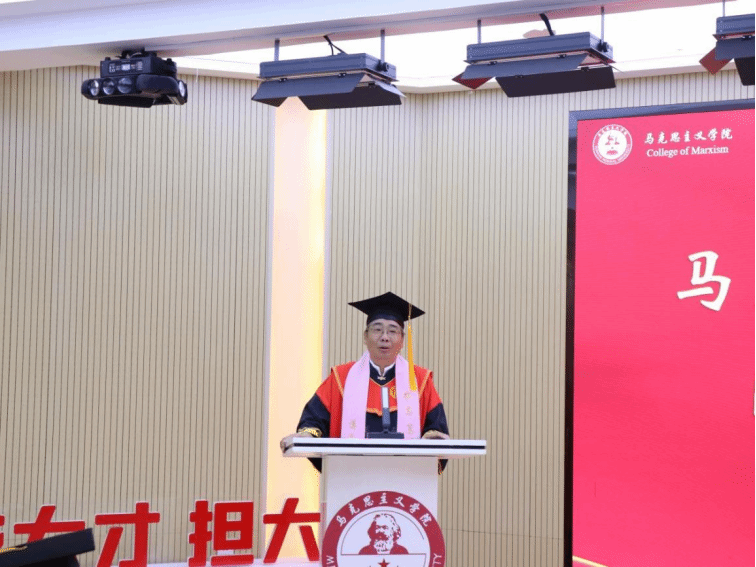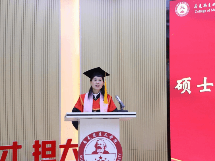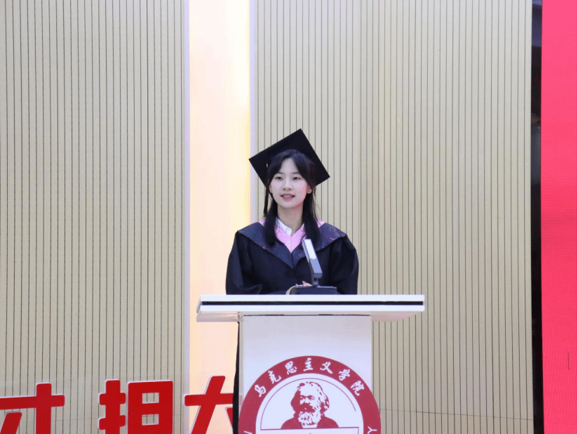 即将赴厦门大学攻读博士学位的朱崴浩作为研究生毕业生代表发言,他回顾了在学院的求学时光和难忘的申博之旅。他感谢每位老师的耐心教导,感谢学院和学校的悉心培养,对一路上帮助过自己的导师、专业老师、领导和辅导员表达了诚挚的感谢,并表示将时刻铭记作为新时代马克思主义者的崇高使命与神圣责任,坚定不移地成为马克思主义最忠诚的学习者与最务实的践行者,用自己的持续奋斗书写属于“马院人”的青春光彩。