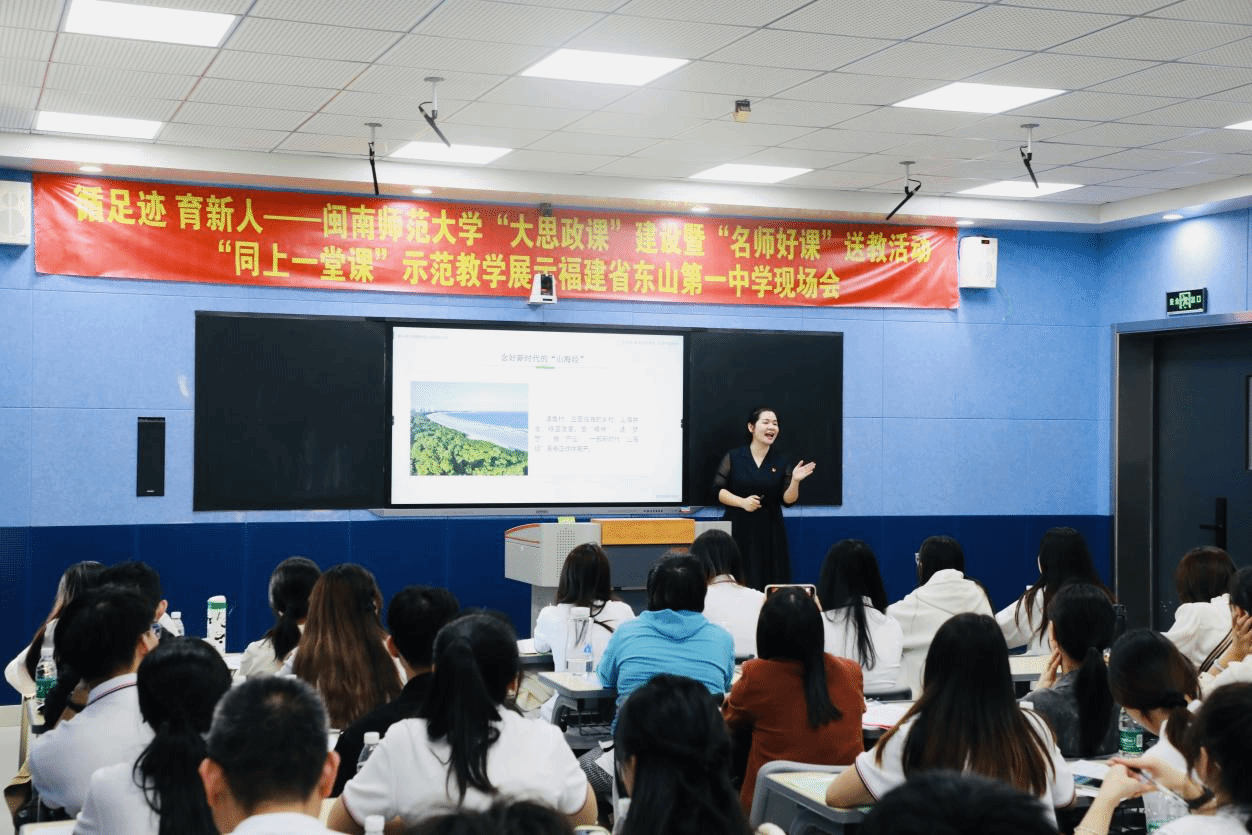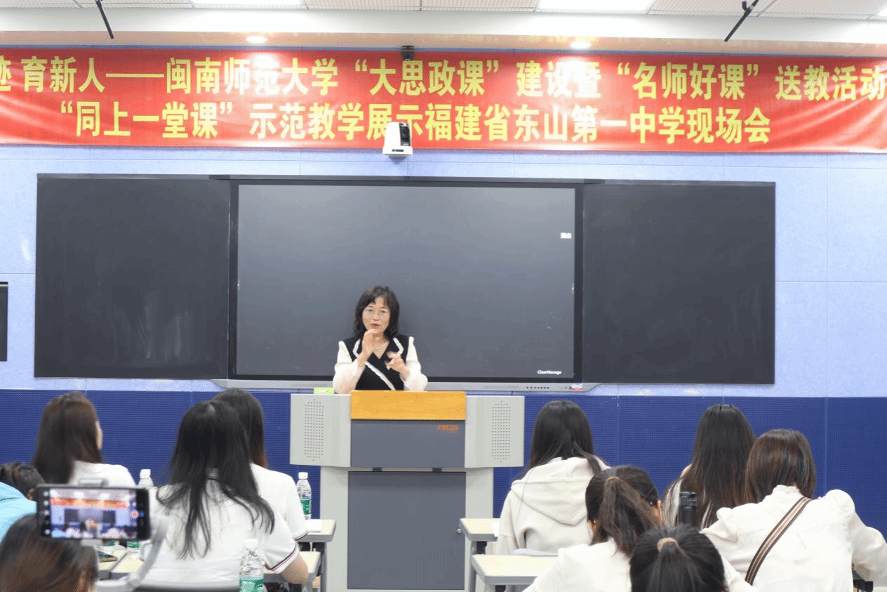 同行,福建省高校“名师好课”送教活动第七组思政课教学名师,东山县教育局、东山一中领导等立足教学教研成果,共研“大思政课”综合改革新路。龙岩学院中央苏区研究院院长杨玉凤教授、福建师范大学协和学院院长杨林香教授、东山第一中学校长许李易等分别做了《把习近平总书记在福建工作期间提出的重要理念、推进的重大实践转化为育人资源的实践与思考》《深化场馆里的思政课实践教学探索》《注重谷风传承 落实育人使命——东山一中“学习谷文昌先进事迹,打造红色教育特色校”办学特色》等主题发言。