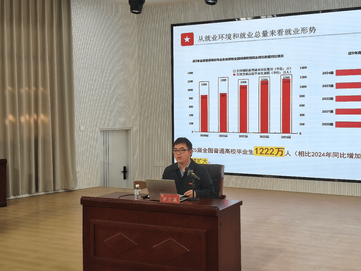 罗立满老师就当前就业形势为同学们进行分析和指导,他通过大量图表和数据,他从全国大学毕业生1222万、前几年待业大学生未来几年不断创新高的毕业生、教师需求减少、人工智能因素等方面全面深入地分析当前高校毕业生面临严峻的就业形势。勉励大家更加理性、清醒地看待当前面临的就业压力,用“抢”“拼”的状态积极主动参与就业市场竞争,拓宽职业选择领域,保持闯的劲头、矢志拼搏奋斗,争取早日就业。