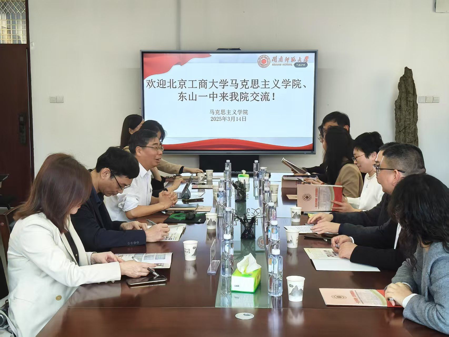 党委书记方琼、院长陈再生、副院长林海燕、毛泽东思想和中国特色社会主义理论体系概论教研室主任林志芳在综合楼404与来宾进行交流。