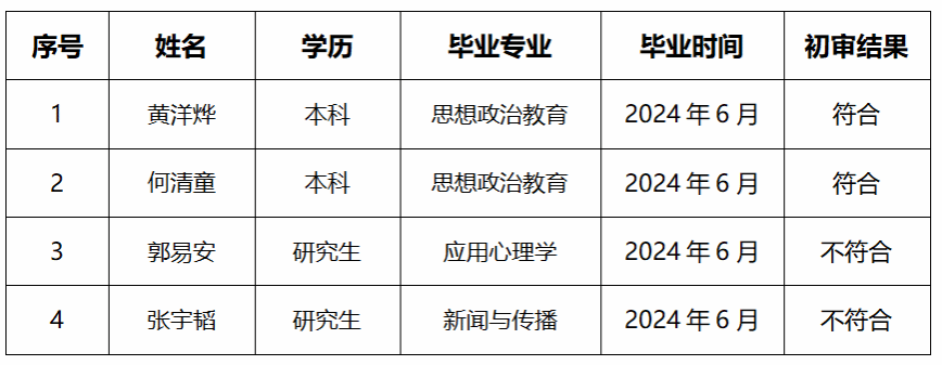根据《动漫屋 面向2024届毕业生公开招聘科研助理招聘启事》基本条件、招聘岗位及要求,经资格审查,现将审查结果公示如下: