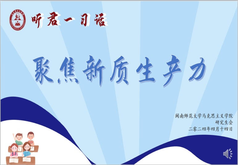 综合楼中区404举行。本次活动主题为“向新而行,创新不止,聚焦新质生产力”,我校新质生产力研究中心博士侯代男副教授参加活动,物理与信息工程学院林文淦、化学化工与环境学院方佳瑜、计算机学院蔡林晟、商学院的段思羽、动漫屋