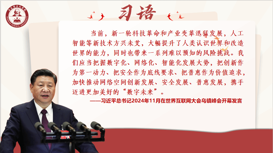 活动伊始,主持人黄诗琴以一段简短的音频向观众展示了习近平总书记在2024年世界互联网大会乌镇峰会开幕式发表的原声讲话,并指出习近平总书记的视频致贺深刻揭示了对信息革命发展趋势的精准洞察。作为新时代的青年马克思主义者,我们应更加重视互联网和人工智能技术的应用。