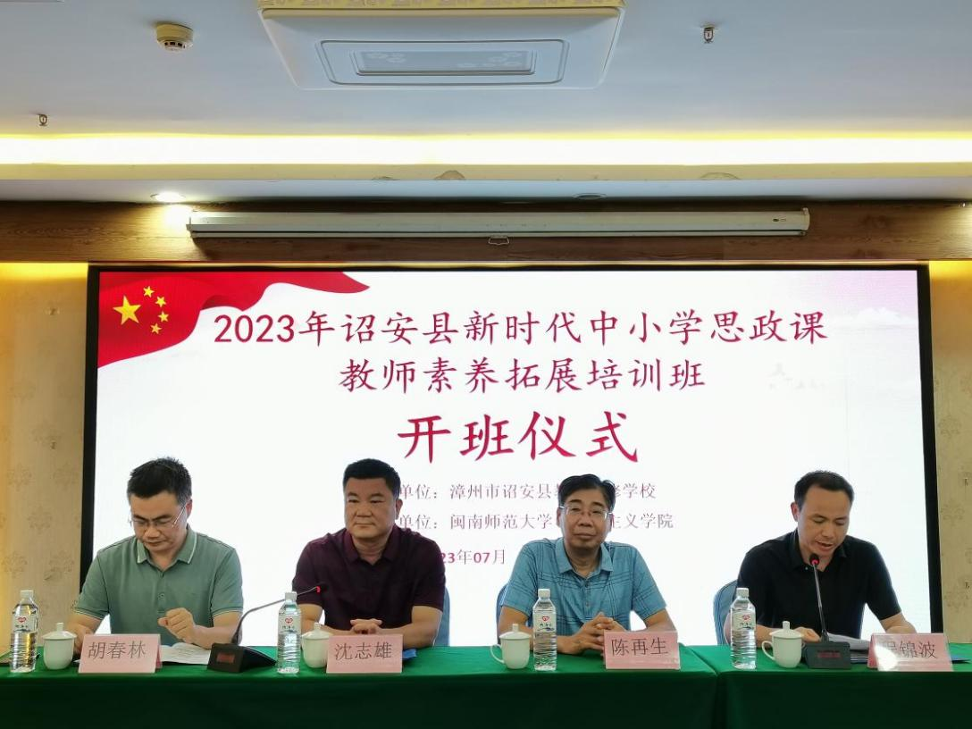 7月30日下午,开班仪式在长汀县丽枫酒店举行。学院院长陈再生、诏安县教育局思政小组组长程锦波、诏安县教师进修学校书记胡春林、诏安县教师进修学校校长沈志雄出席开班式。诏安县教育局思政小组组长程锦波为开班式致辞,明确了思政课教师的重大使命任务和艰巨任务,并对此次培训寄予了期待。陈再生院长在开班仪式上发言,指出此次培训班开班不易,希望学员们学有所得、不虚此行,同时简要介绍了学院的办学特色、办学优势、办学成绩。诏安县教师进修学校沈志雄校长在开班仪式上对动漫屋