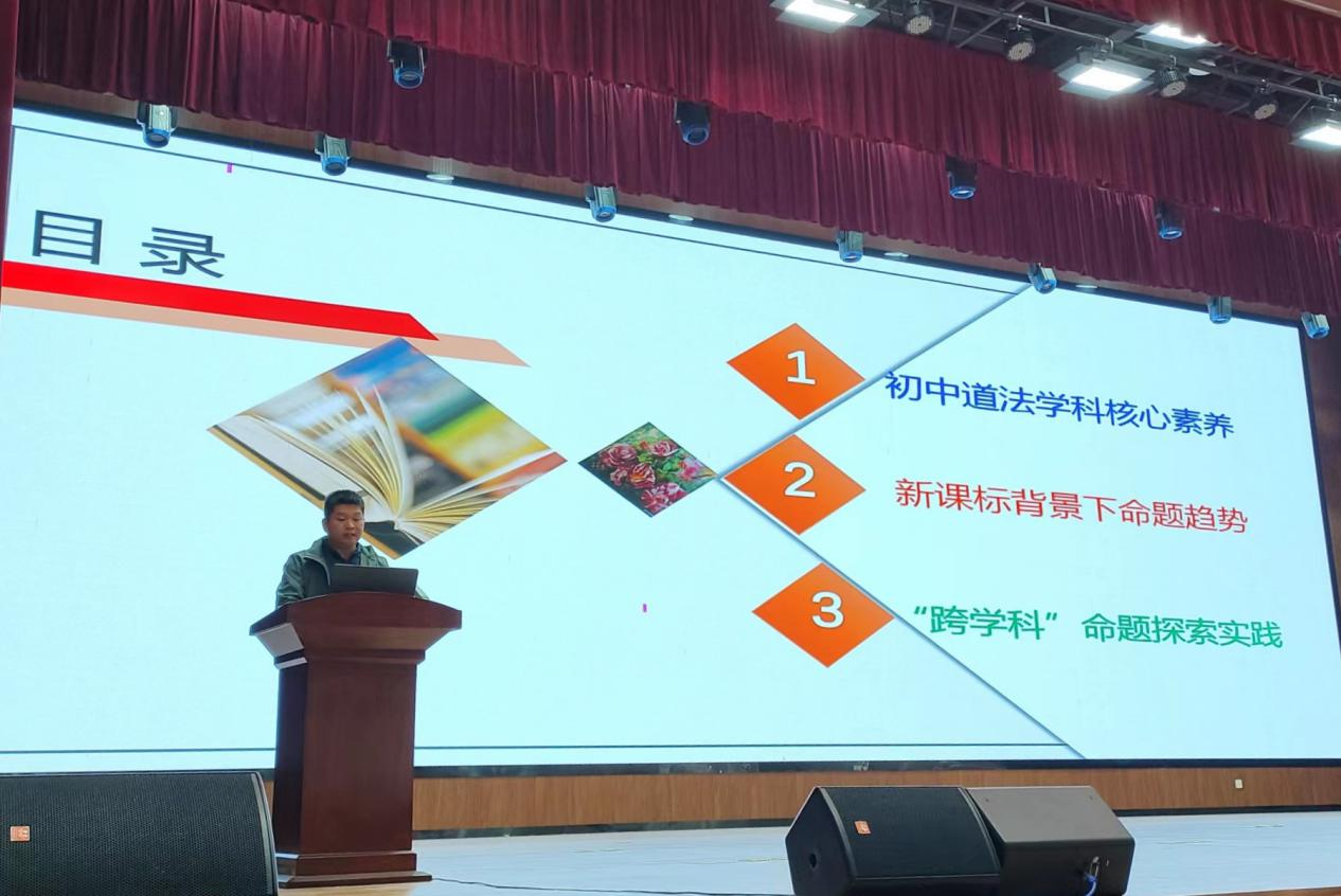 开班仪式后,泉州外国语学校培训处主任,泉州市初中道法梁耀胜名师工作室核心成员杜增产老师应邀做了《基于核心素养要求的思政课跨学科命题探究》的专题讲座。