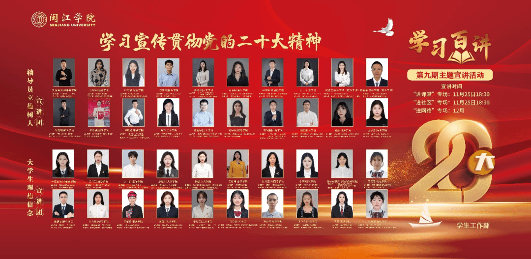 闽江学院学生工作部举办的学习宣传贯彻党的二十大精神暨“学习百讲”第九期主题宣讲日前开讲。辅导员“立德树人”宣讲团和大学生“理想信念”宣讲团40名宣讲员走进课堂,为全校千余名学生干部开展主题宣讲,在全校学生中掀起学习宣传贯彻党的二十大精神热潮。宣讲前,校党委书记叶世满向宣讲团成员做学习宣传贯彻党的二十大精神专题宣讲辅导,并为辅导员“立德树人”宣讲团和大学生“理想信念”宣讲团授旗。