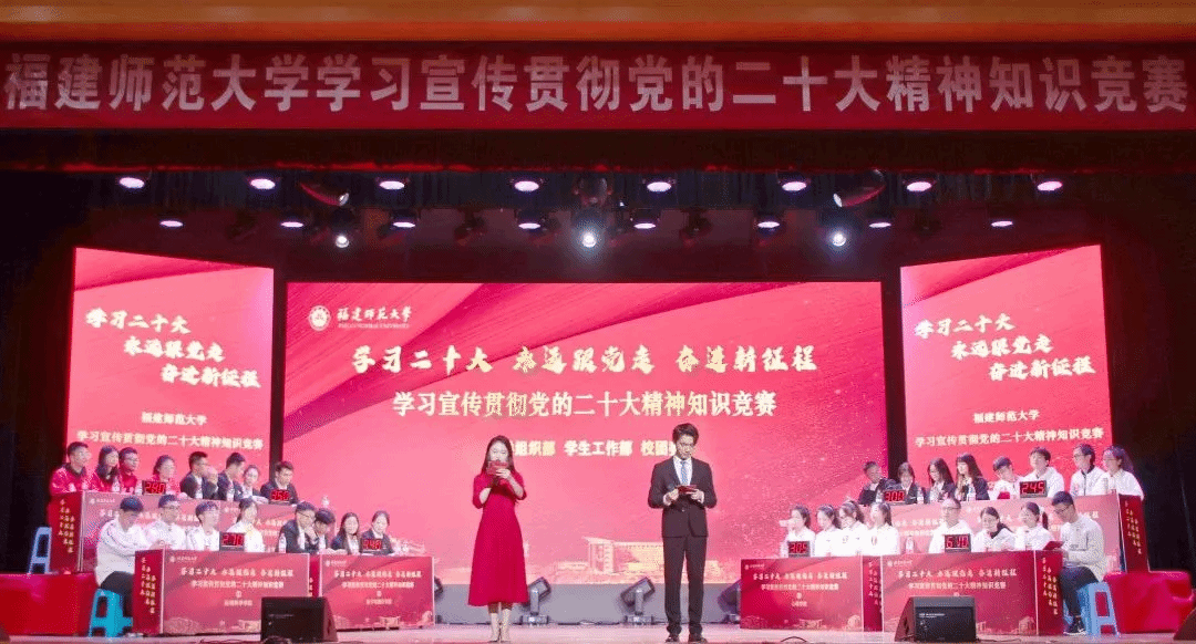 12月3日,福建师范大学举办学习宣传贯彻党的二十大精神知识竞赛决赛。网络初赛通过“青马易战”应用答题开展,共有23个学院的18564名学生参赛,答题总数累计7730893题,评选出“答题积极分子”500名。经过初赛选拔,共有8支队伍进入现场决赛。决赛设置“团结一致,敢闯敢试”“星星之火,可以燎原”“只争朝夕,不负韶华”三个环节,采取依次回答和抢答相结合的方式,包括判断题、单选题、填空题和视频题,涵盖党的二十大报告、党史党章等内容。在《小兵张嘎》《雷锋》《烈火中永生》等视频题的答题环节,现场出现小高潮,互动环节也得到了现场观众的积极抢答。经过三轮激烈角逐,动漫屋
