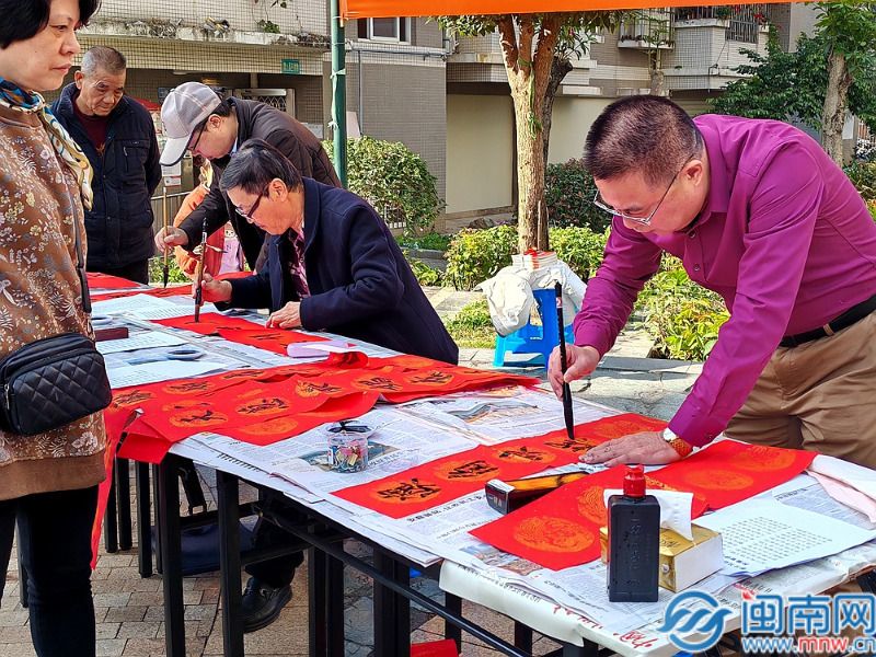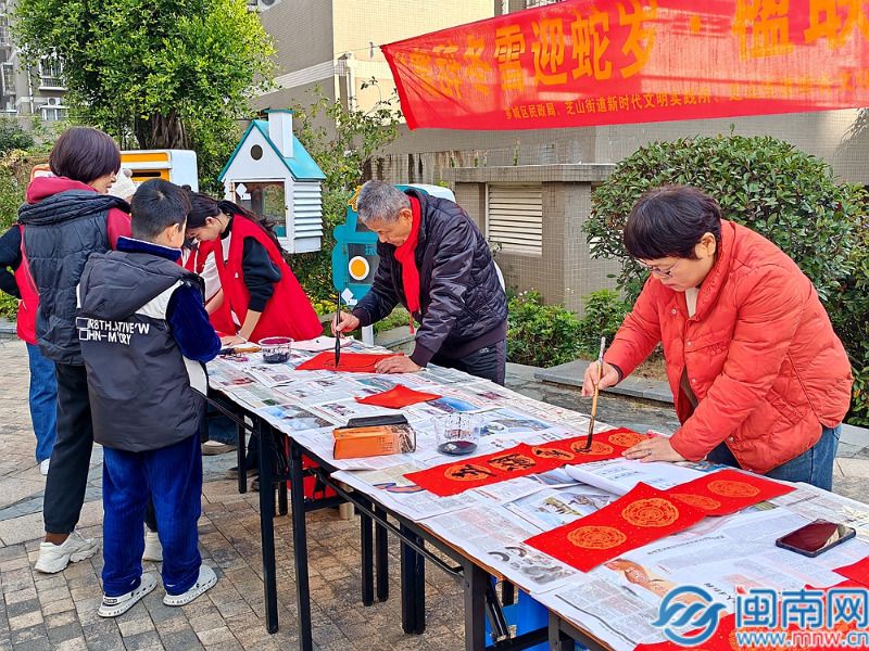 和社区书法爱好者挥毫泼墨、笔走龙蛇,行、隶、草等多种书体各显神韵,一个个苍劲有力的福字和寓意吉祥的春联跃然纸上。从“习习春风"到“盈盈喜气",从“幅蓝图描丽景"到”八闽福地漾春光",一幅幅寓意吉祥的春联承载着满满的美好祝福,书写出新时代的盛世华章。