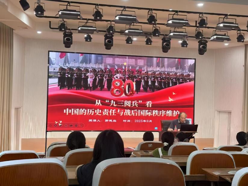 师生作“从九三阅兵看中国的历史责任与战后国际秩序维护”专题讲座,院党委副书记邓战军主持。(通讯员 周榆幸)