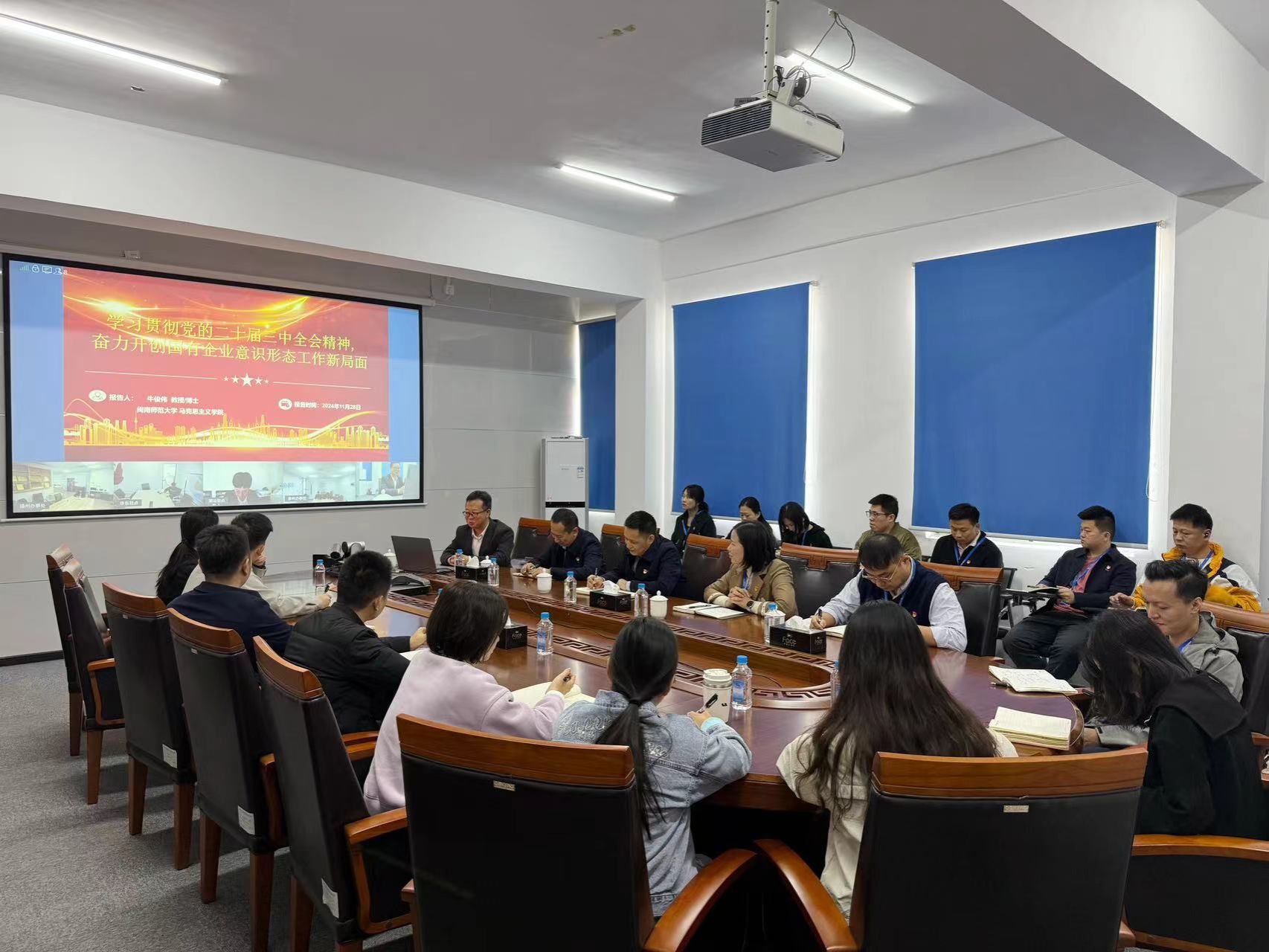 牛俊伟教授为该公司党员干部职工作《深入学习贯彻党的二十届三中全会精神,奋力开创国有企业意识形态工作新局面》的专题报告。(通讯员 牛俊伟)