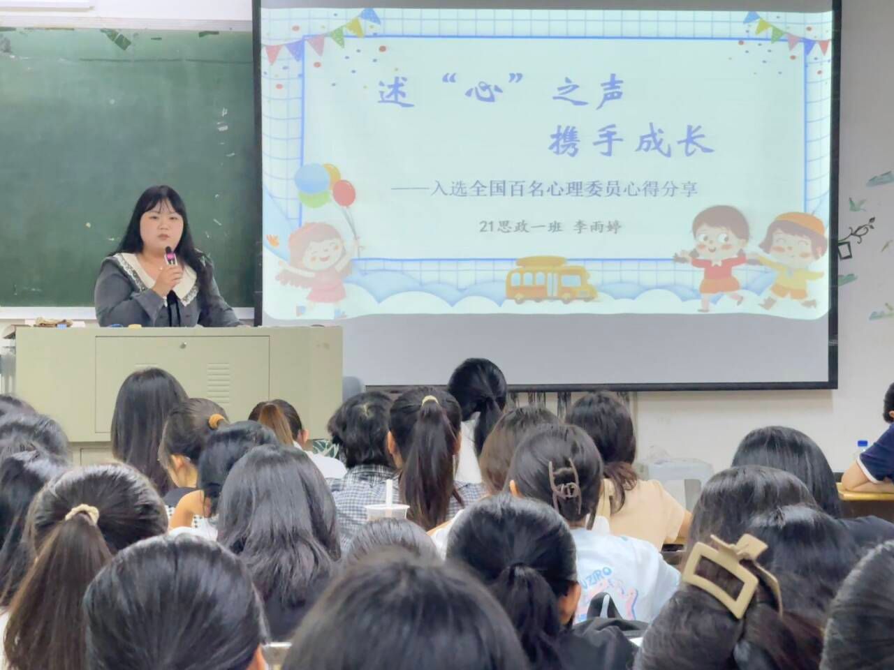 入选“全国百名心理委员风采展”的21级思政一班心理委员李雨婷为全体心理委员、宿舍心理信息员进行了以“述‘心’之声 携手成长”为主题的心得分享。(通讯员 施心瑜)