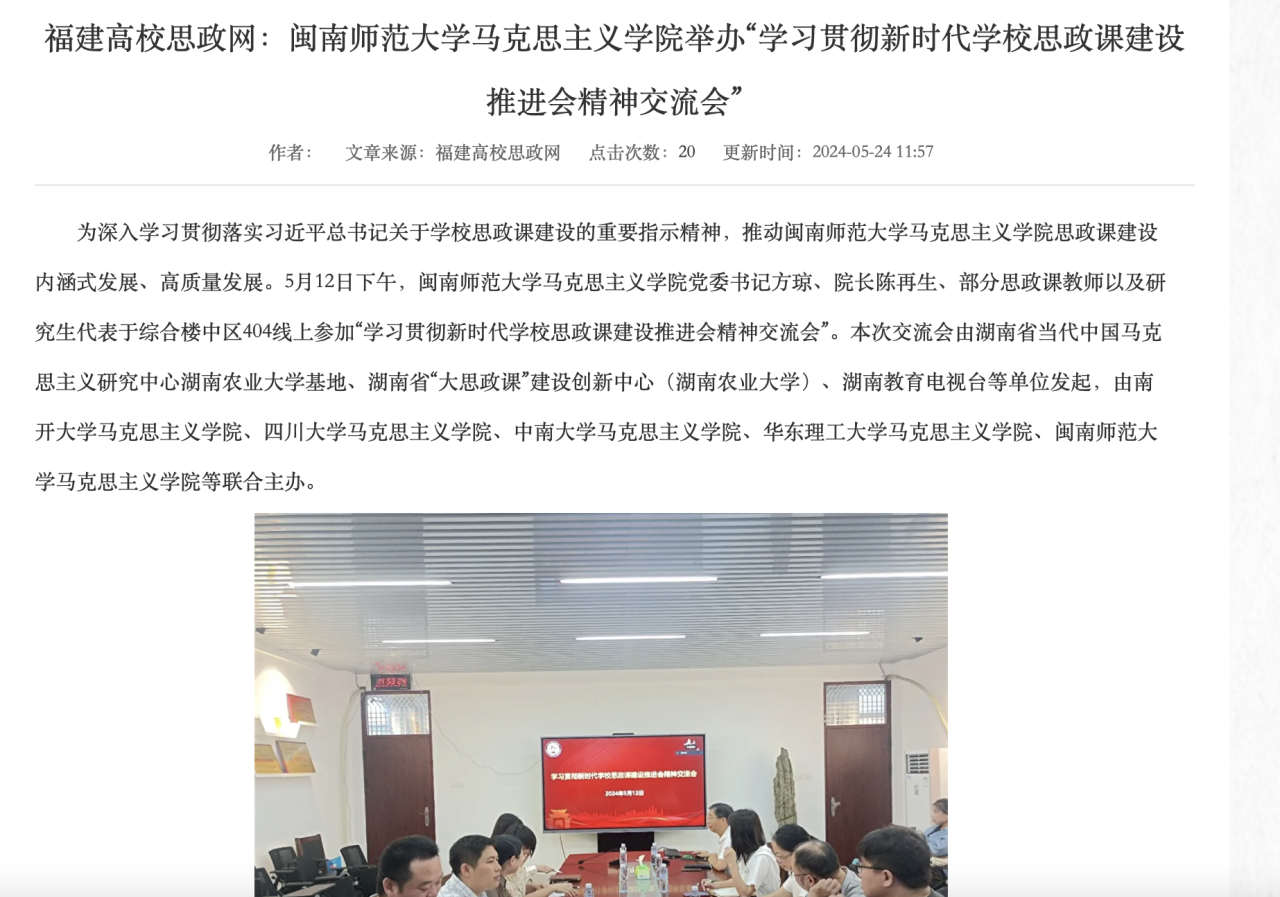 举办的“学习贯彻新时代学校思政课建设推进会精神交流会”受到福建高校思政网平台的专题报道。(通讯员 林晨)