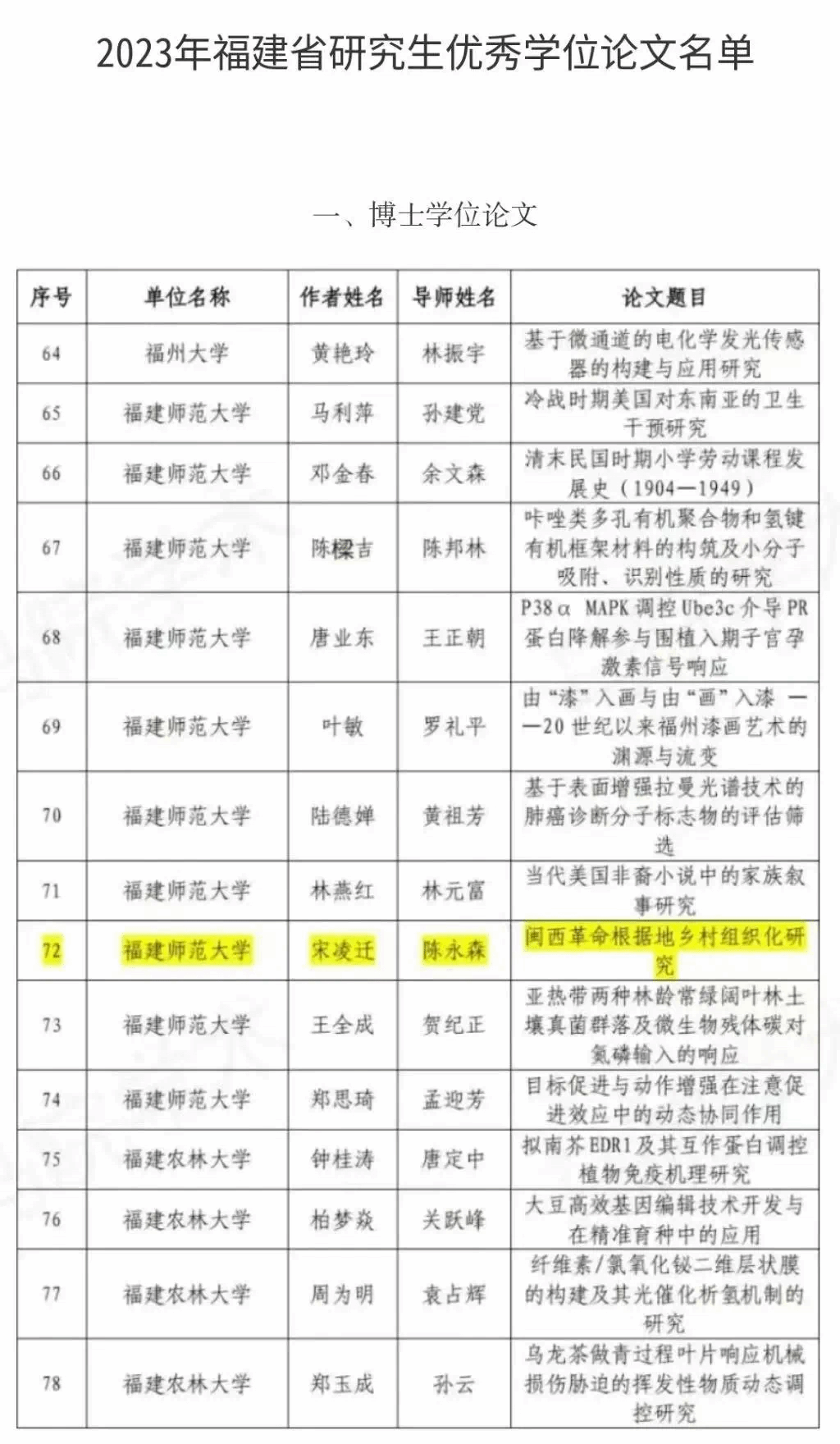 教师宋凌迁的博士学位论文获评2023年福建省研究生优秀研究生学位论文。(通讯员 崔梓祎)